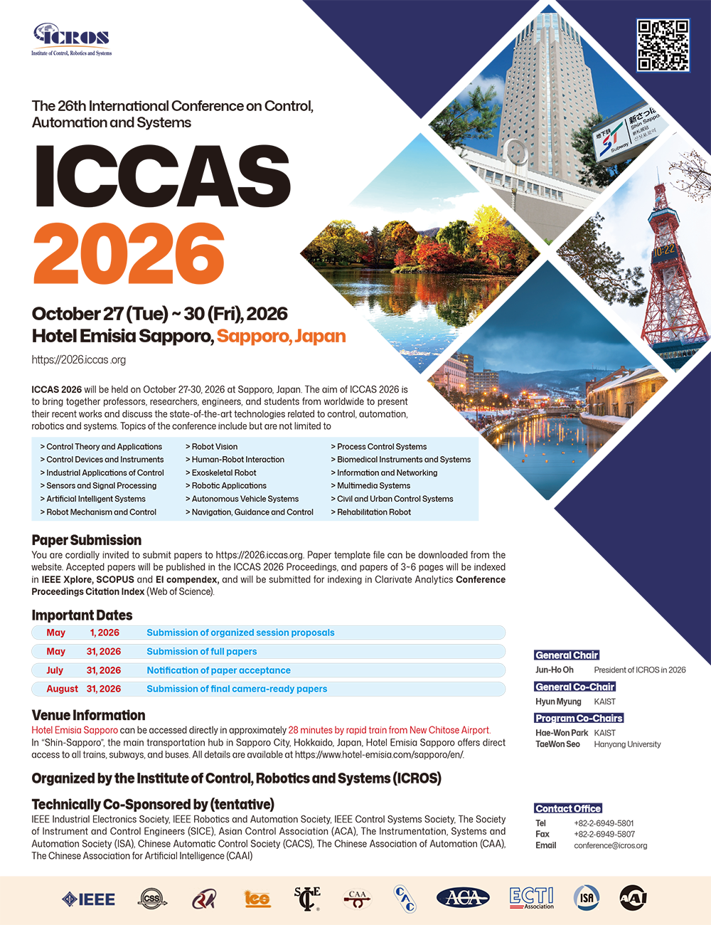 ICCAS 2026: Oct. 27(Tue) ~ 30(Fri), 2026, Hotel Emisia, Sapporo, Japan
